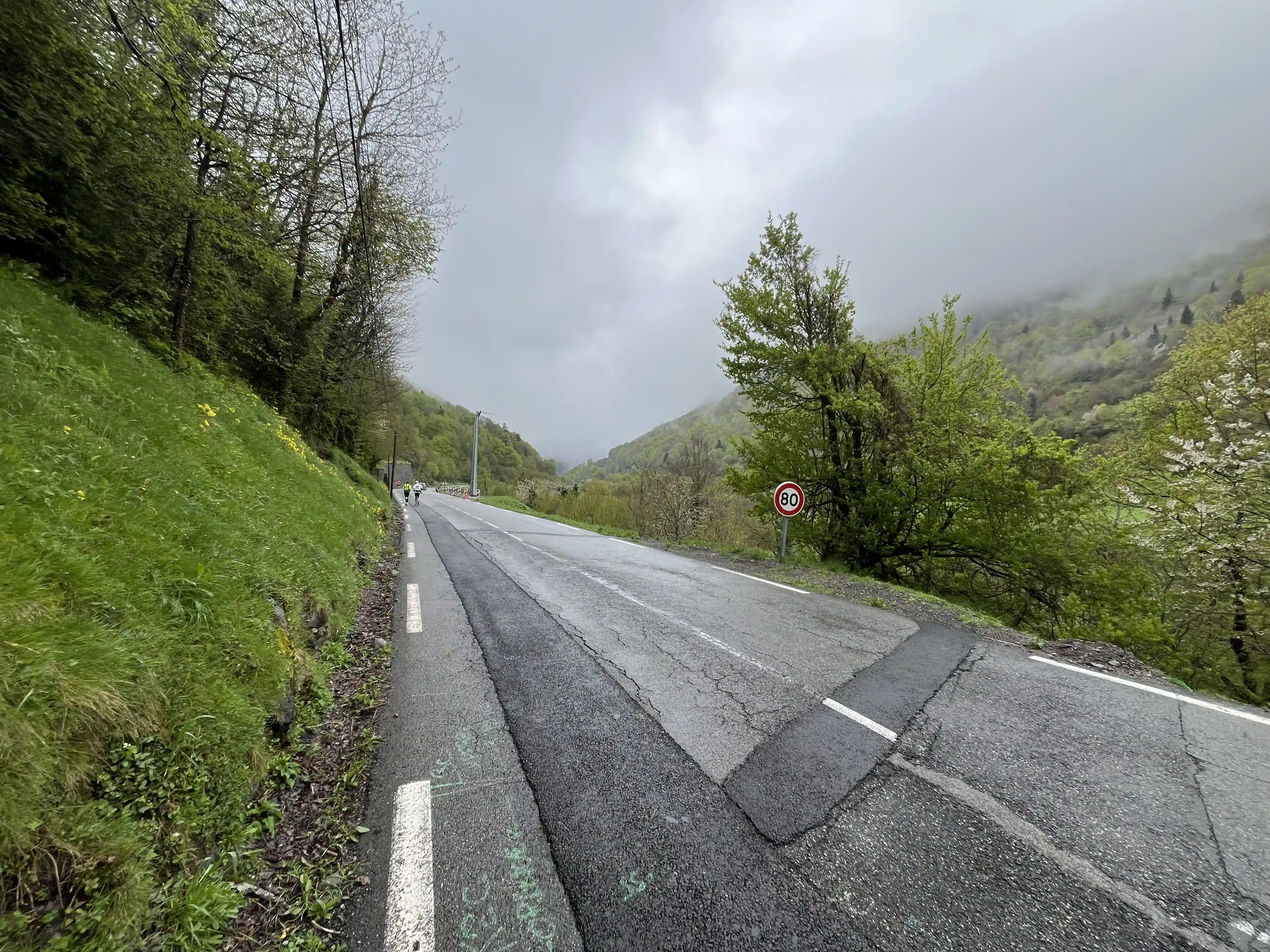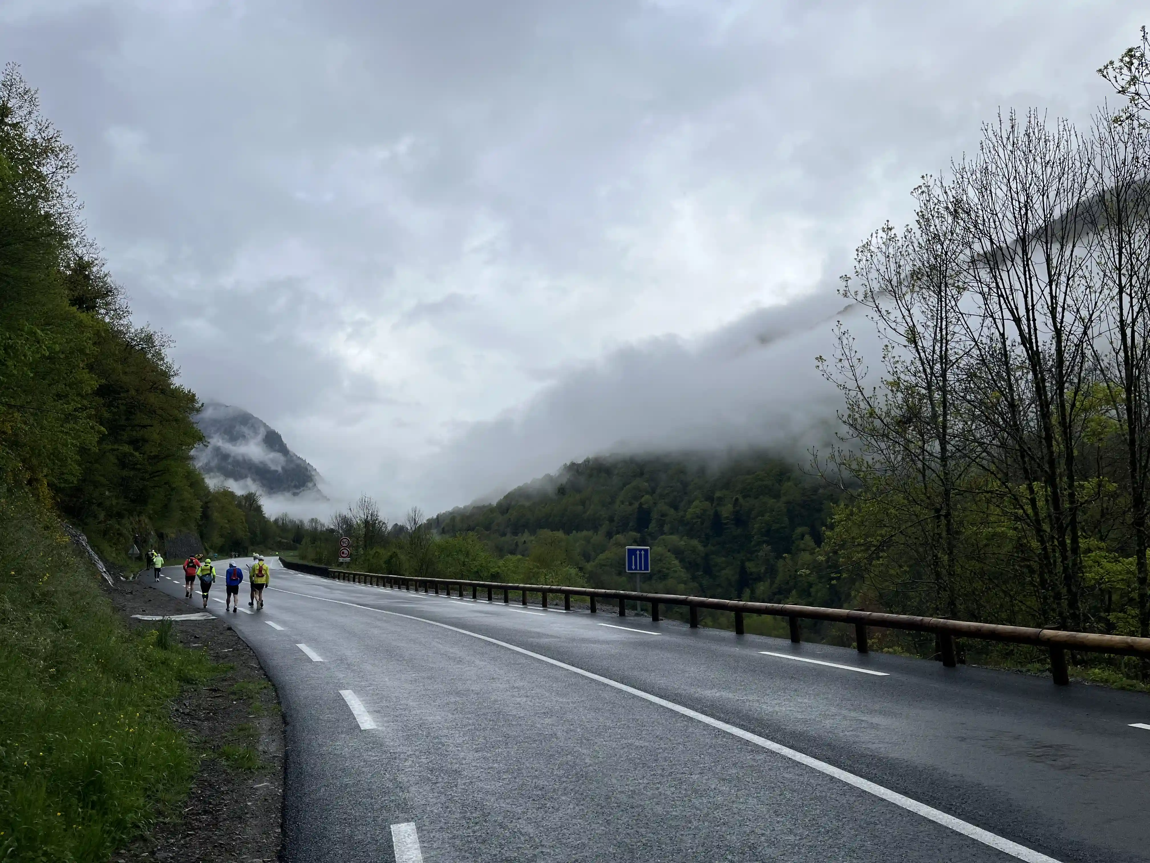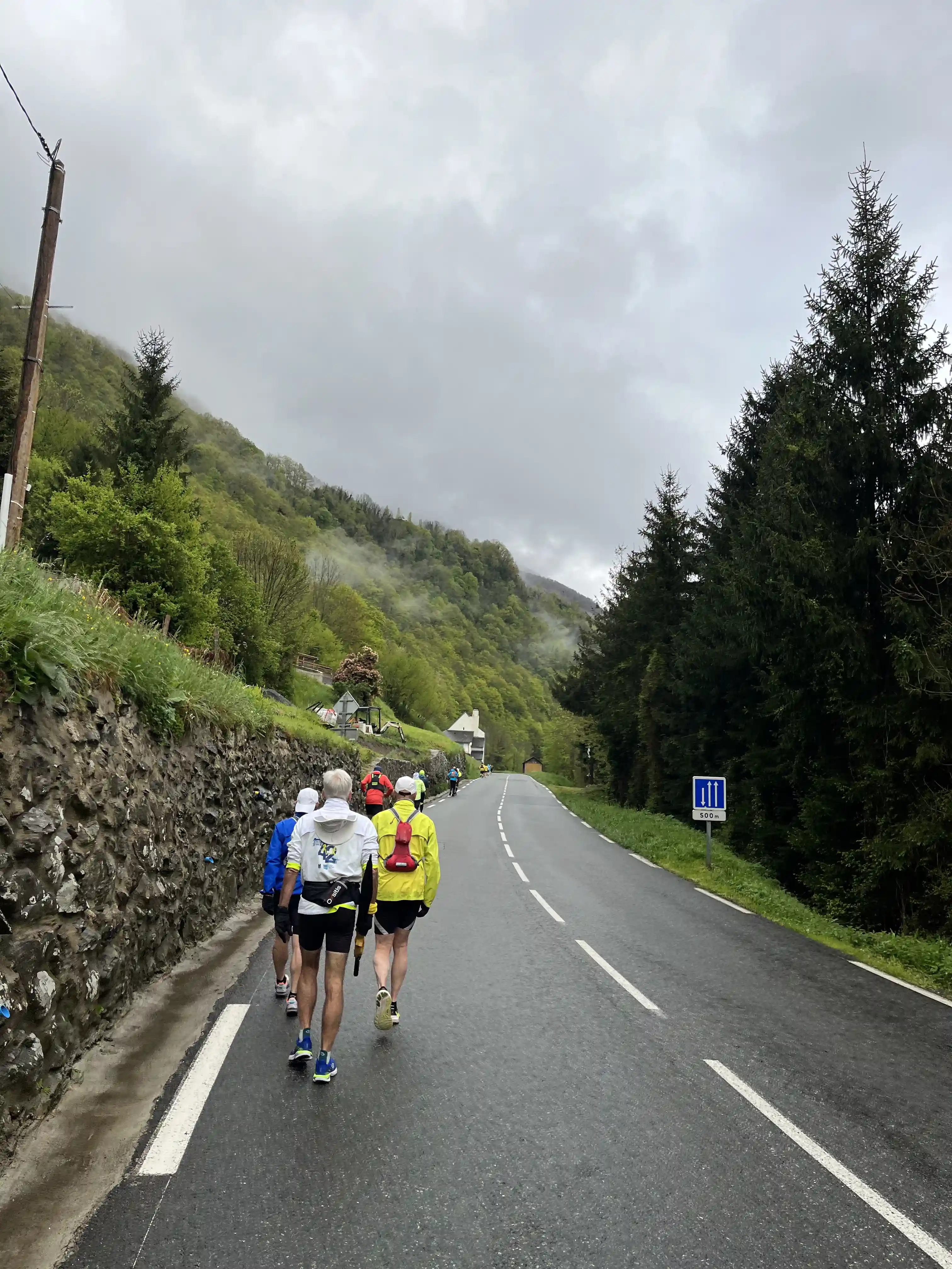 We gathered in the town square for a very quick pre-race briefing, and the count-down to 9am went by quickly. And we were off. Starting with a quick lap around town (possibly the most exciting thing to happen in Urdos each year), we then hit the road for the long (1000m, 15km) climb to Col de Somport and the French/Spain border. It was a fairly steady climb, so it was just run-a-bit, walk-a-bit, and do whatever was necessary to maintain a good body temperature (run too much, it got hot, walk to much it got cold). It wasn’t so much rain as light drizzle — just enough to get the phone wet, but really not enough to otherwise worry us.