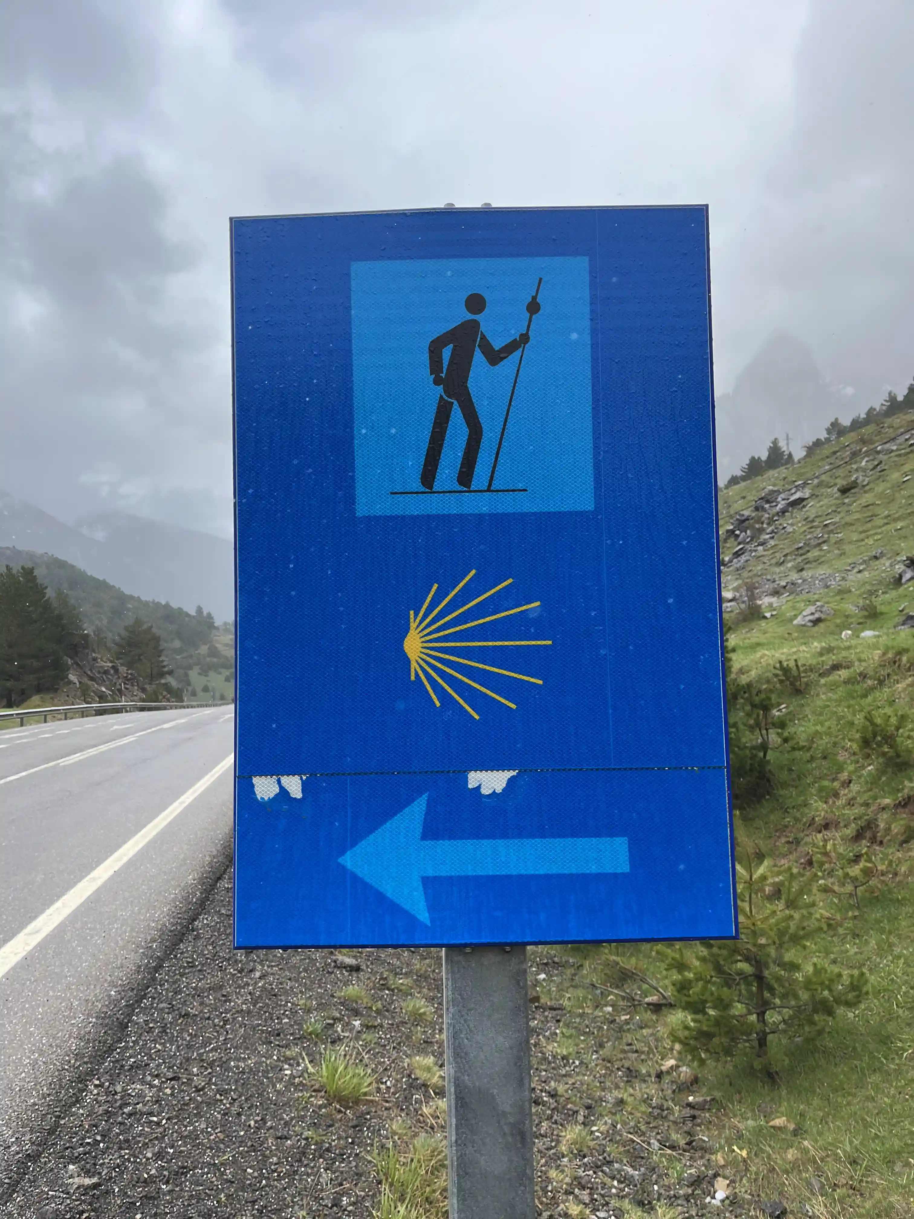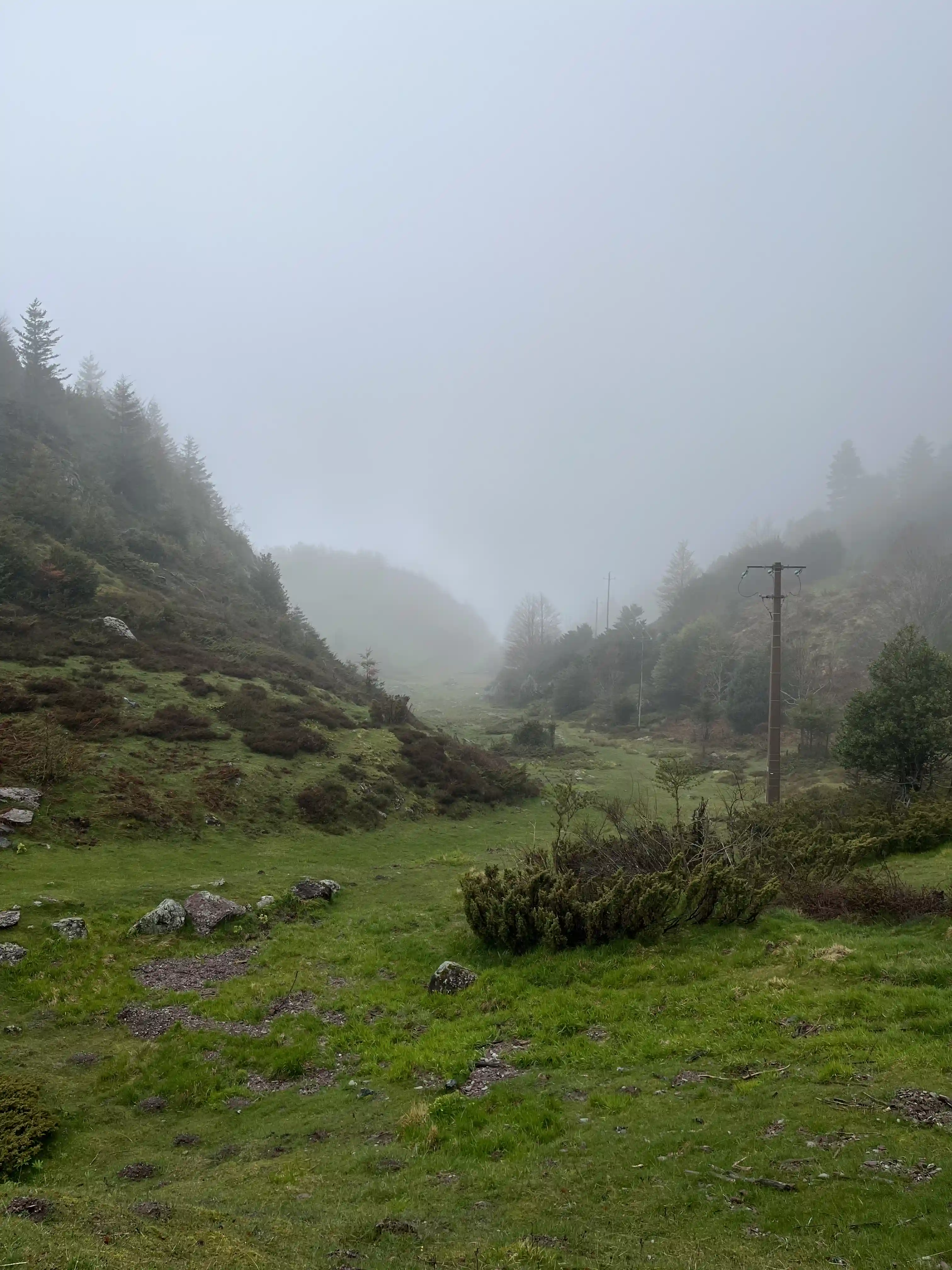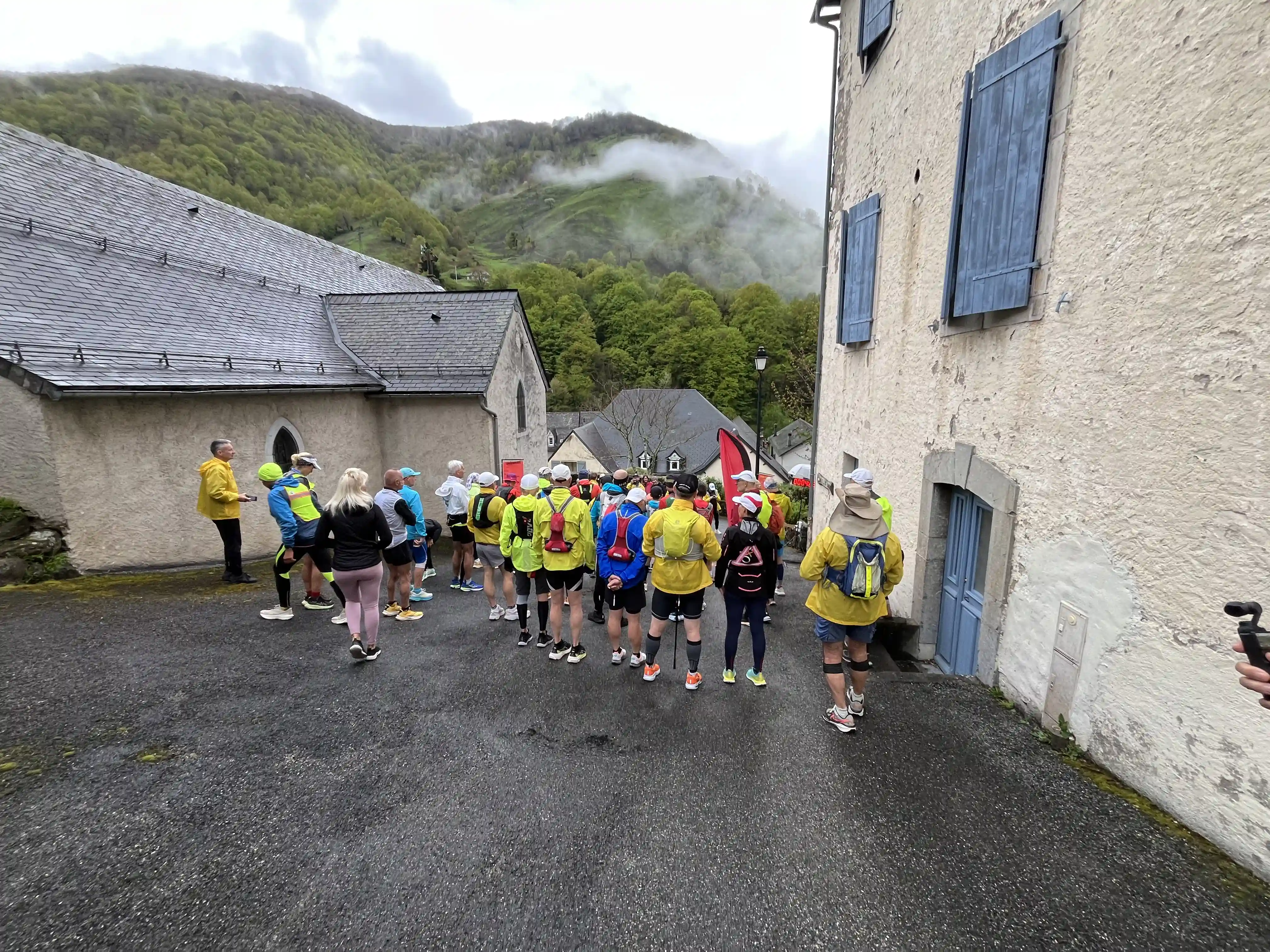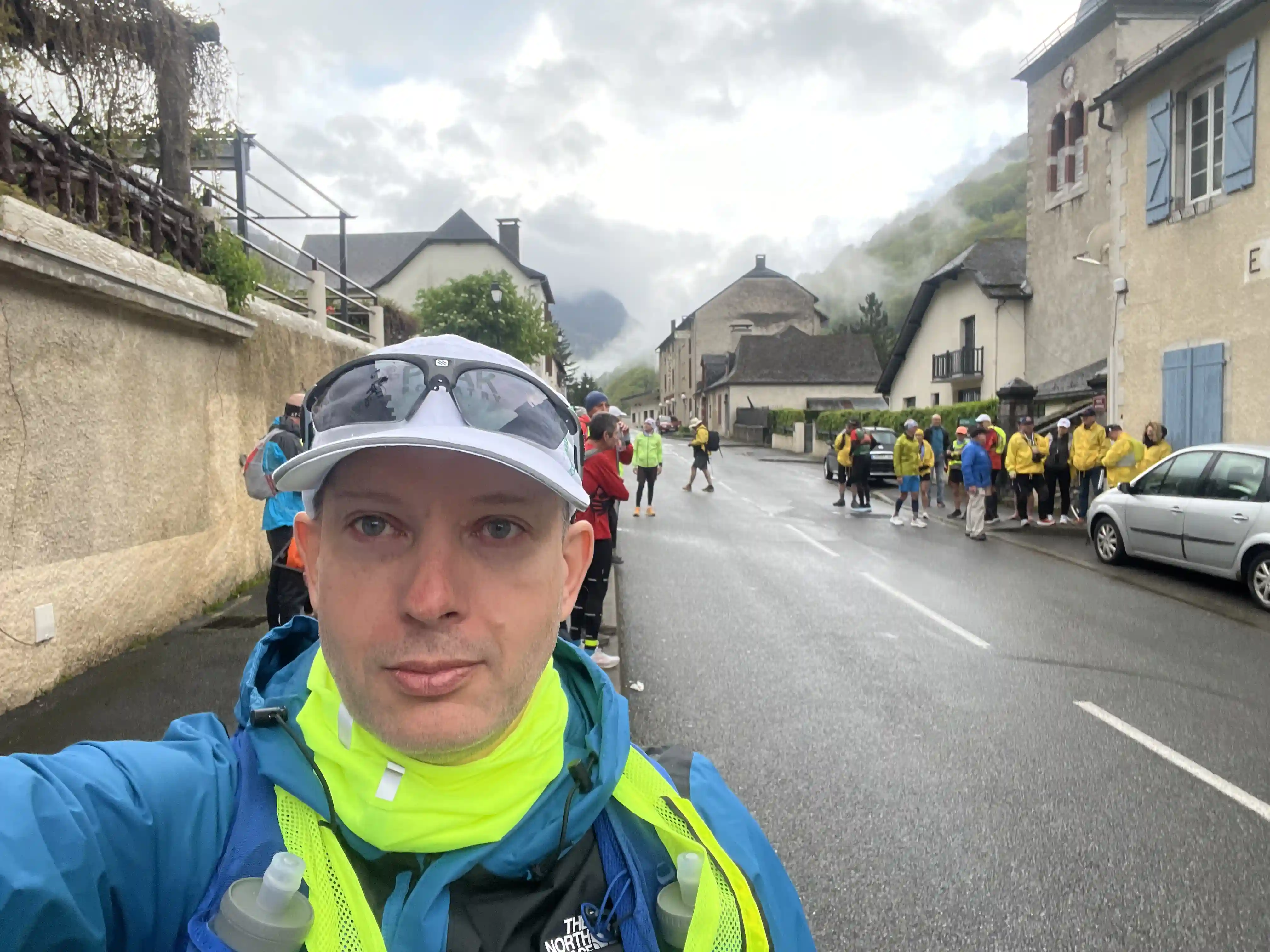 We gathered in the town square for a very quick pre-race briefing, and the count-down to 9am went by quickly. And we were off. Starting with a quick lap around town (possibly the most exciting thing to happen in Urdos each year), we then hit the road for the long (1000m, 15km) climb to Col de Somport and the French/Spain border. It was a fairly steady climb, so it was just run-a-bit, walk-a-bit, and do whatever was necessary to maintain a good body temperature (run too much, it got hot, walk to much it got cold). It wasn’t so much rain as light drizzle — just enough to get the phone wet, but really not enough to otherwise worry us.