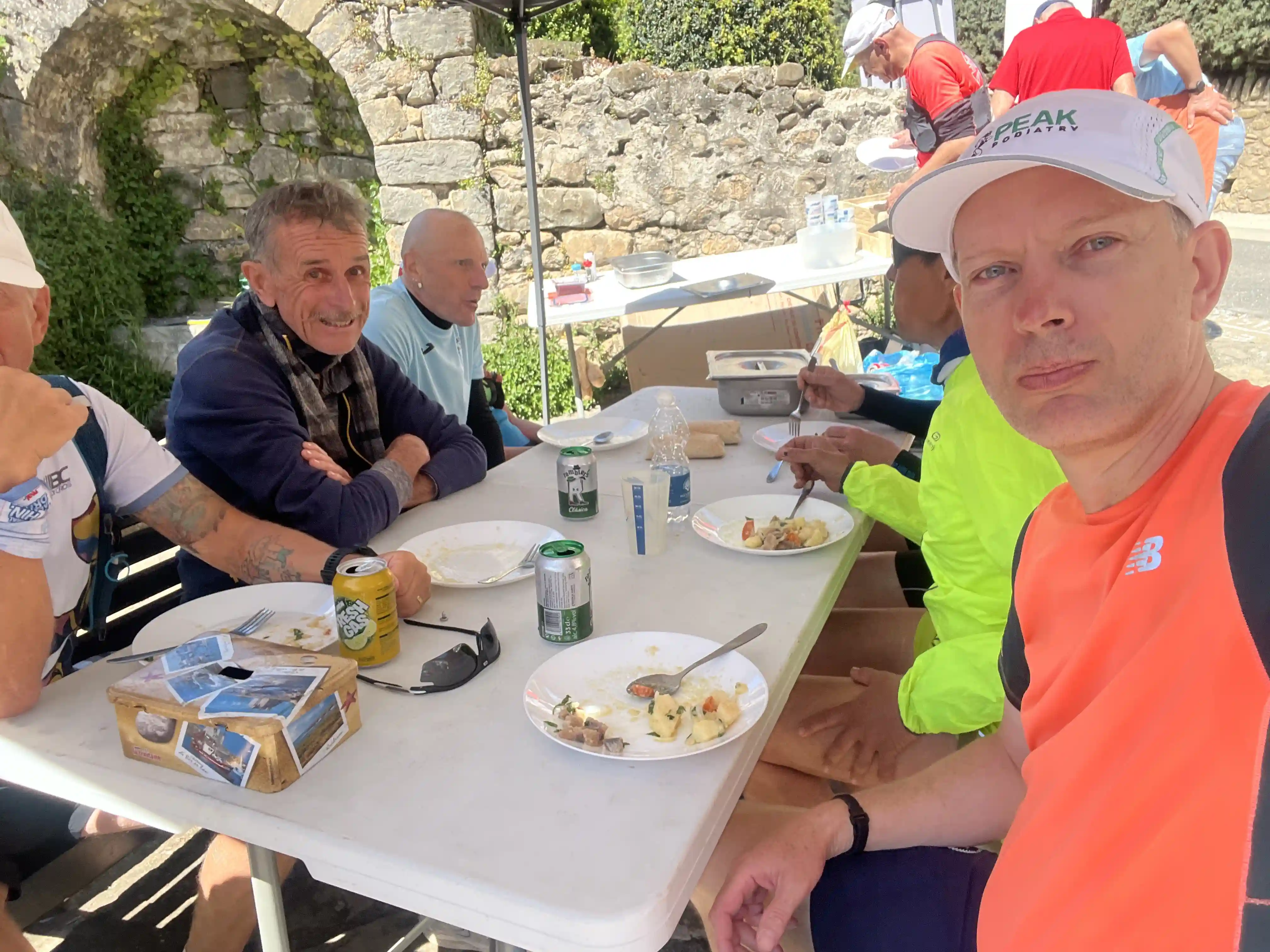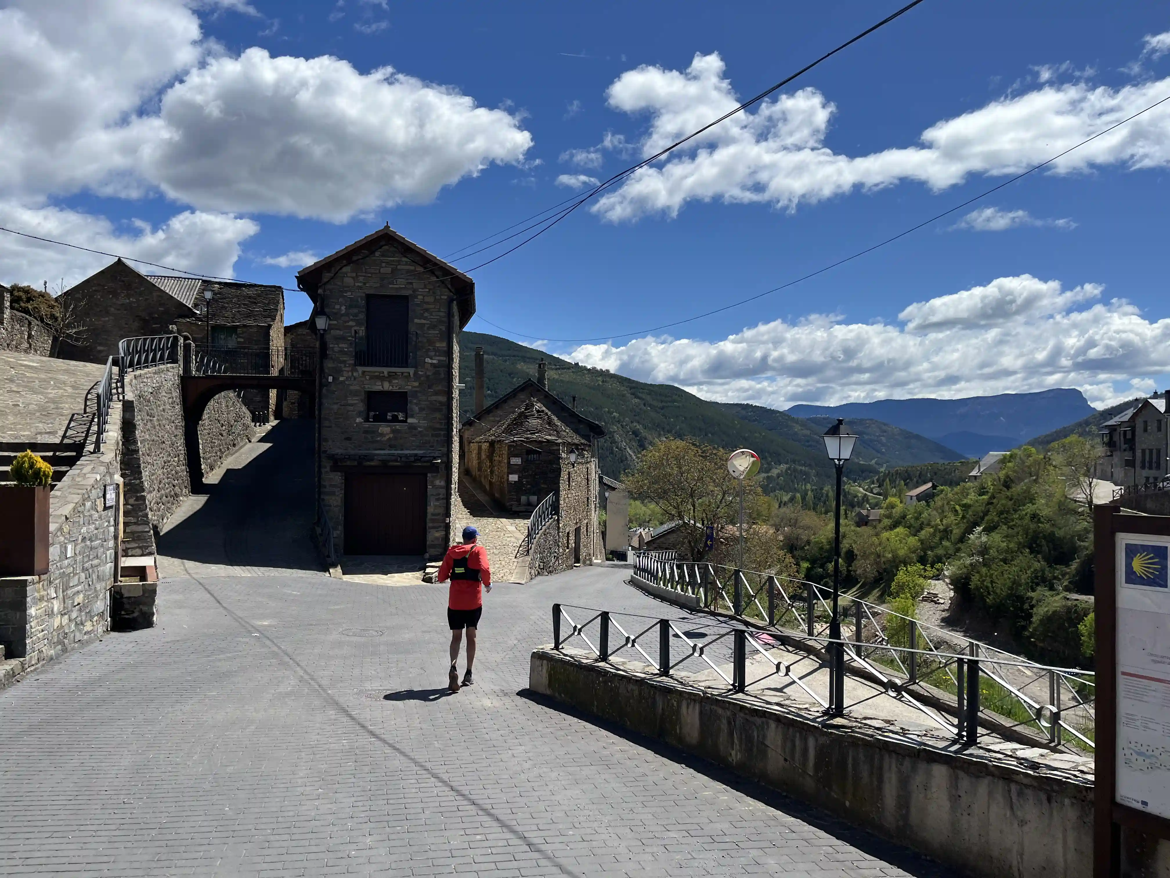 Into the town of Jaca for the finish line. We had to run through the whole town pretty much, and then finished at the bottom of a hill. Greeted by many smiling faces, and it was straight into a beer and some finish line food (which I thought was a meat dish, but no, it was fish… whoops). Had a chat with a few of the other runners, and then made my way to the hostel. It’s five to a room tonight, and ’cause I was last in I get a top bunk (apologies to the guy under me … I’ll be up and down all night!)